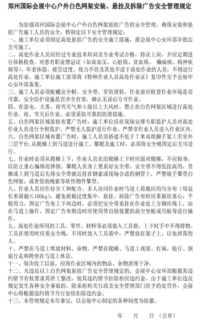 鄭州國(guó)際會(huì)展中心戶外白色網(wǎng)架安裝、懸掛及拆除廣告安全管理規(guī)定