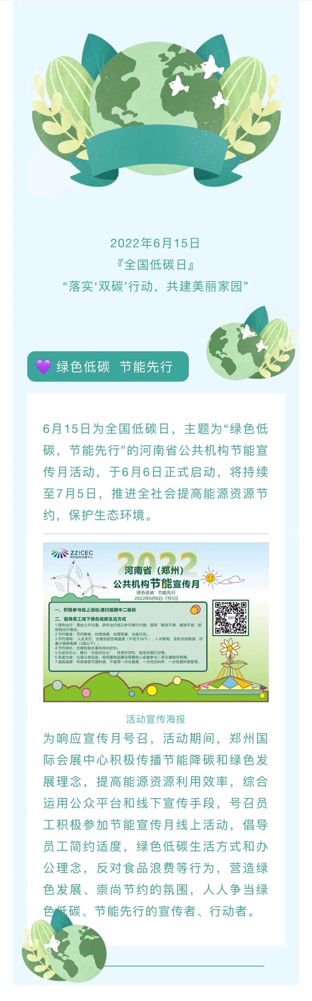 6月15日為全國低碳日,主題為“綠色低碳,節(jié)能先行”的河南省公共機構節(jié)能宣傳月活動,于6月6日正式啟動,將持續(xù)至7月5日。為響應宣傳月號召,活動期間,鄭州國際會展中心積極傳播節(jié)能降碳和綠色發(fā)展理念,提高能源資源利用效率,綜合運用公眾平臺線和線下宣傳手段,號召員工積極參加節(jié)能宣傳月線上活動,倡導員工簡約適度,綠色低碳生活方式和辦公理念,反對食品浪費等內(nèi)容,營造綠色發(fā)展、崇尚節(jié)約的氛圍,人人爭當綠色低碳、節(jié)能先行的宣傳者、行動者、引領者。